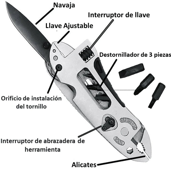 Imagina tener a mano alicates, cortador de alambre, diferentes destornilladores, navaja, y llave expansiva, todo en uno ✅