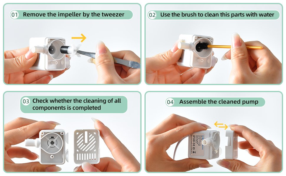 1. La limpieza de la bomba puede prolongar la larga vida útil de la bomba, te recomendamos limpiar la bomba cada medio mes, lo que puede evitar que la suciedad bloquee la vía fluvial, lo que resulta en una vía fluvial obstruida, mala calidad del agua, ruido y otros fenómenos anormales.