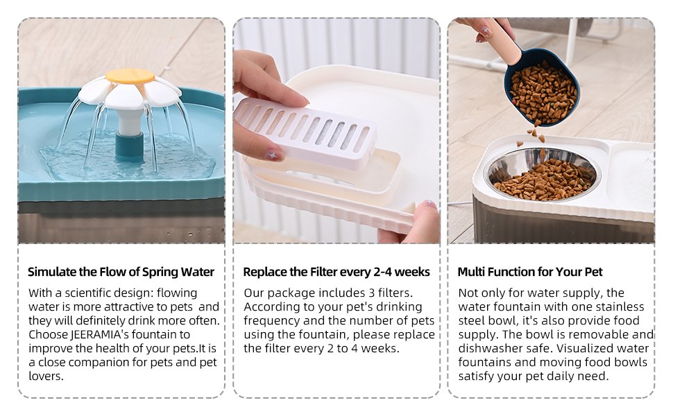 - Diseño de cascada de flores: el agua corriente atrae la atención de su mascota, haciéndola más divertida de beber. Nuestra fuente de agua para gatos simula el agua de manantial natural, dando a tu mascota más frescura y ya no odia el agua potable