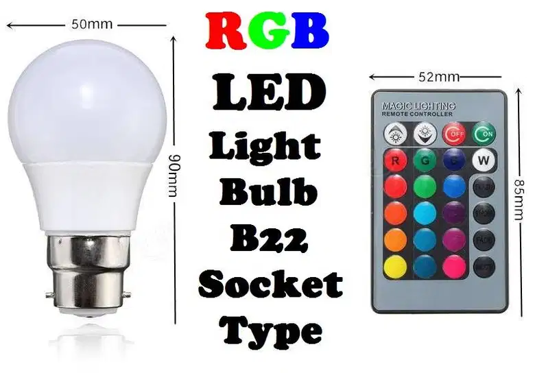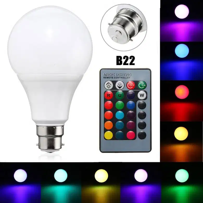 De un vistazo … Encaja en su casquillo de bombilla B22 estándar. Puede utilizar adaptadores / convertidores de enchufe para cualquier tipo de base / accesorio por ejemplo, bayoneta B22 a E27.Controlado por un mando a distancia por infrarrojos inalámbrico. Múltiples modos: Flash, Strobe, Fade, Smooth. Varios colores. Especificaciones generales: Colores: rojo, verde, azul, blanco, MÁS 12 combinaciones más Brillo: 240 lúmenes. Ángulo de haz: foco, 45/60 grados.