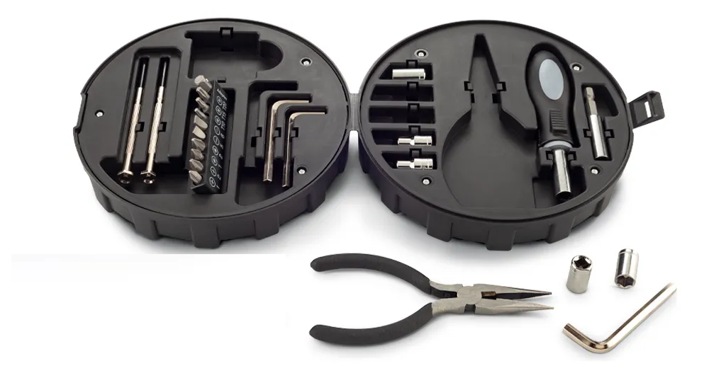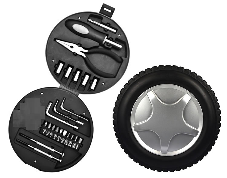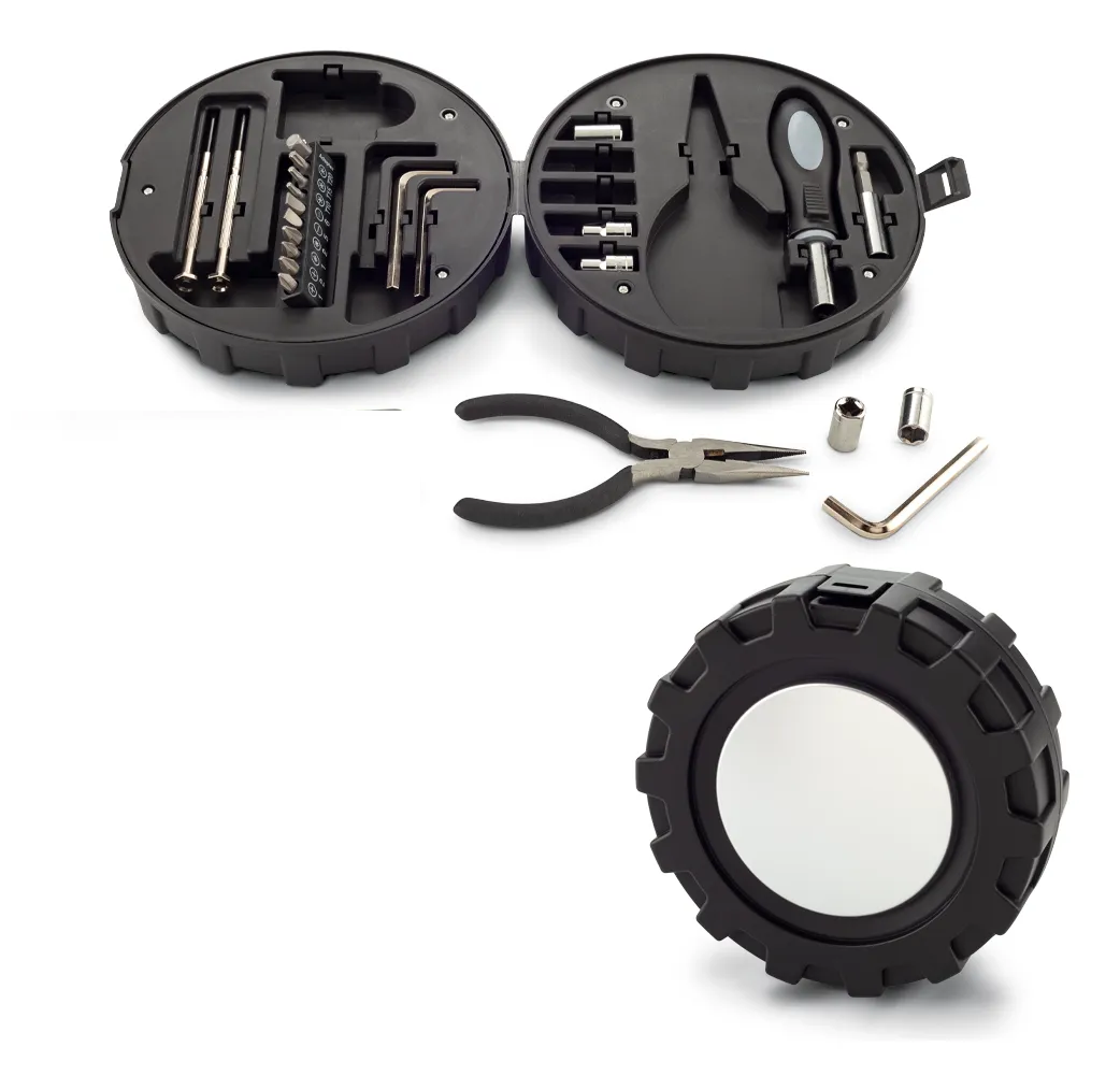 - SET DE HERRAMIENTAS EN FORMA DE LLANTA X 24 PIEZASDESCRIPCIÓN:Set de Herramientas en Forma de Llanta X 24 Piezas.