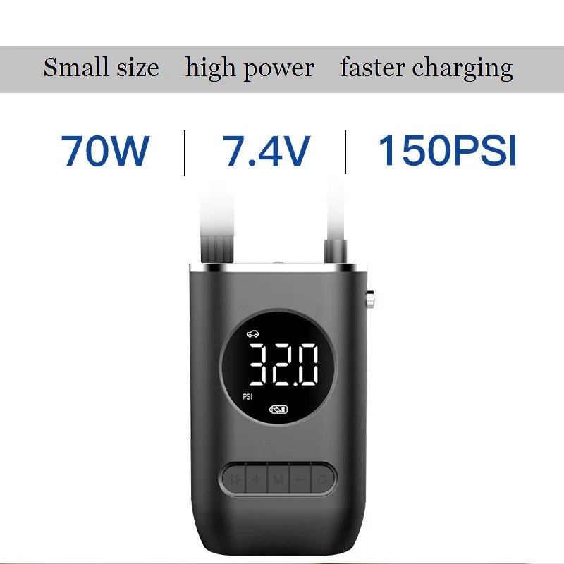 Este calibrador tiene luces LED que facilitan su uso durante la noche. Además, su tamaño compacto y su material flexible te permiten guardarlo cómodamente y llevarlo a donde lo necesites.El calibrador digital inalámbrico de compresores de neumáticos para automóviles, motocicletas y bicicletas tiene una capacidad de batería de 4000 mAh. Con una potencia de 70 W, alcanza una presión máxima de inflado de 130 PSI.Su voltaje de 7,4 V y su flujo de presión de aire de 30 L/min garantizan un buen rendimiento. Además, disipa el calor rápidamente.El paquete contiene 1 bomba de aire, 4 boquillas de aire para diferentes tipos de válvulas, 1 cable de carga tipo C, 1 tubo inflable, 1 bolsa de almacenamiento y 1 manual de instrucciones.