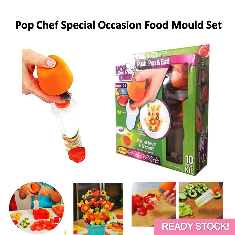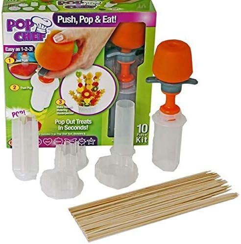 Cortador de frutas y vegetales Pop Chef es una herramienta de cocina para decorar pasteles, arreglos de frutas y también vegetales de manera entretenida y original. Solo debes seleccionar un molde, ubicarlo en el alimento, presionar el Pop Chef hacia abajo y ya está lista tu fruta o vegetal con la forma del molde.