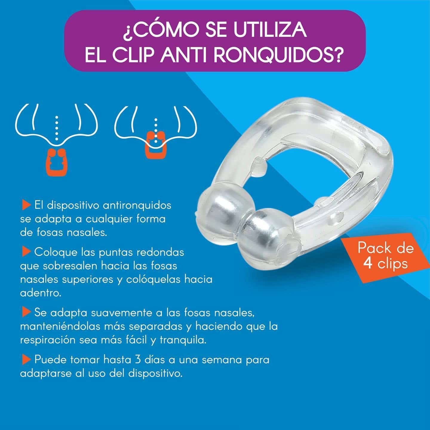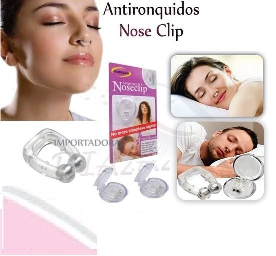 Clip Anti-ronquidos magnetico: Ayuda a disminuir su frecuencia e intensidad. Es un dispositivo de silicona en forma de (U) cuyos extremos estan provistos de un iman. Gracias a estos imanes va a ayudar a disminuir la frecuencia y la intensidad de los ronquidos por efectos mangneticos. Uso: Antes de dormir, colocar la pinza en la nariz de manera que los extremos presionen el tabique nasal. original, con estuche y manual de uso.
