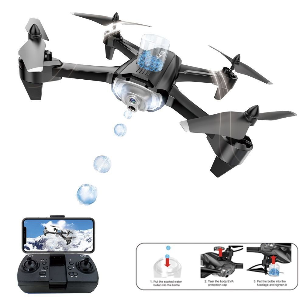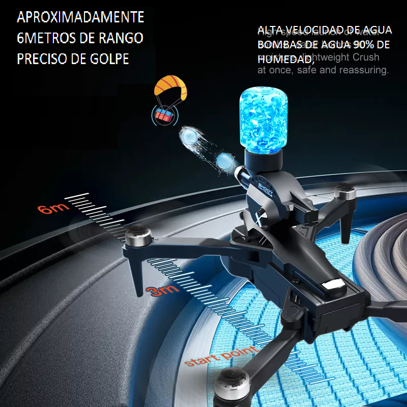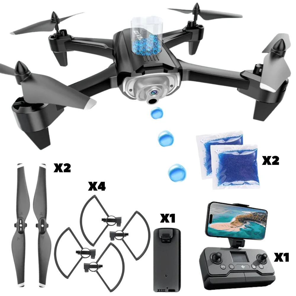 Una de las características más destacadas del drone es su función de disparo de esferas de hidrogel. Que se pueden cargar en el dron y disparar desde el aire. Esto agrega una dimensión completamente nueva y divertida a tu experiencia de vuelo. Puedes participar en emocionantes batallas con amigos o simplemente disfrutar de la diversión de disparar y ver las bolitas de gel caer desde el cielo.