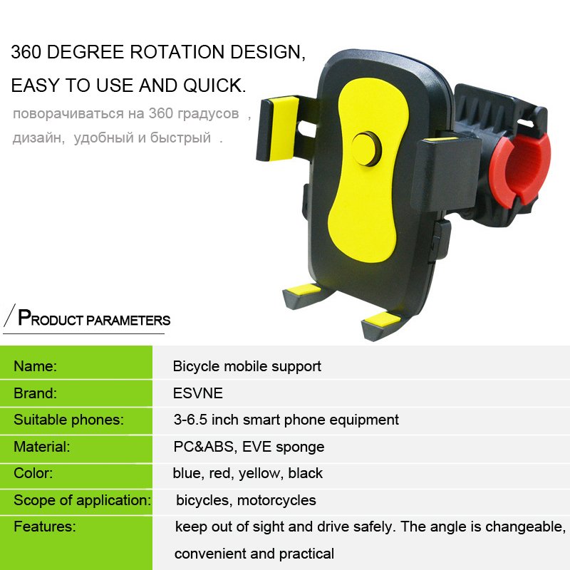 Soporte de teléfono móvil de montar bicicleta Universal 360 Rotation para iPhone 5 6 7 más Xiaomi 4 5 Samsung s8.Soporte para teléfono moblie-Base de ventosa de silicona. Aplicar al teléfono móvil universal. MATERIAL:ABS + esponja .Diseño robusto, sin tornillos. Soporta un ángulo de rotación de 360 ​​grados que puede sujetar el teléfono verticalmente y lateralmente.Con tamaño de clip flexible adecuado para el teléfono inteligente de 3.5-6 pulgadas (se expande hasta 90 mm de ancho). Operación con una mano