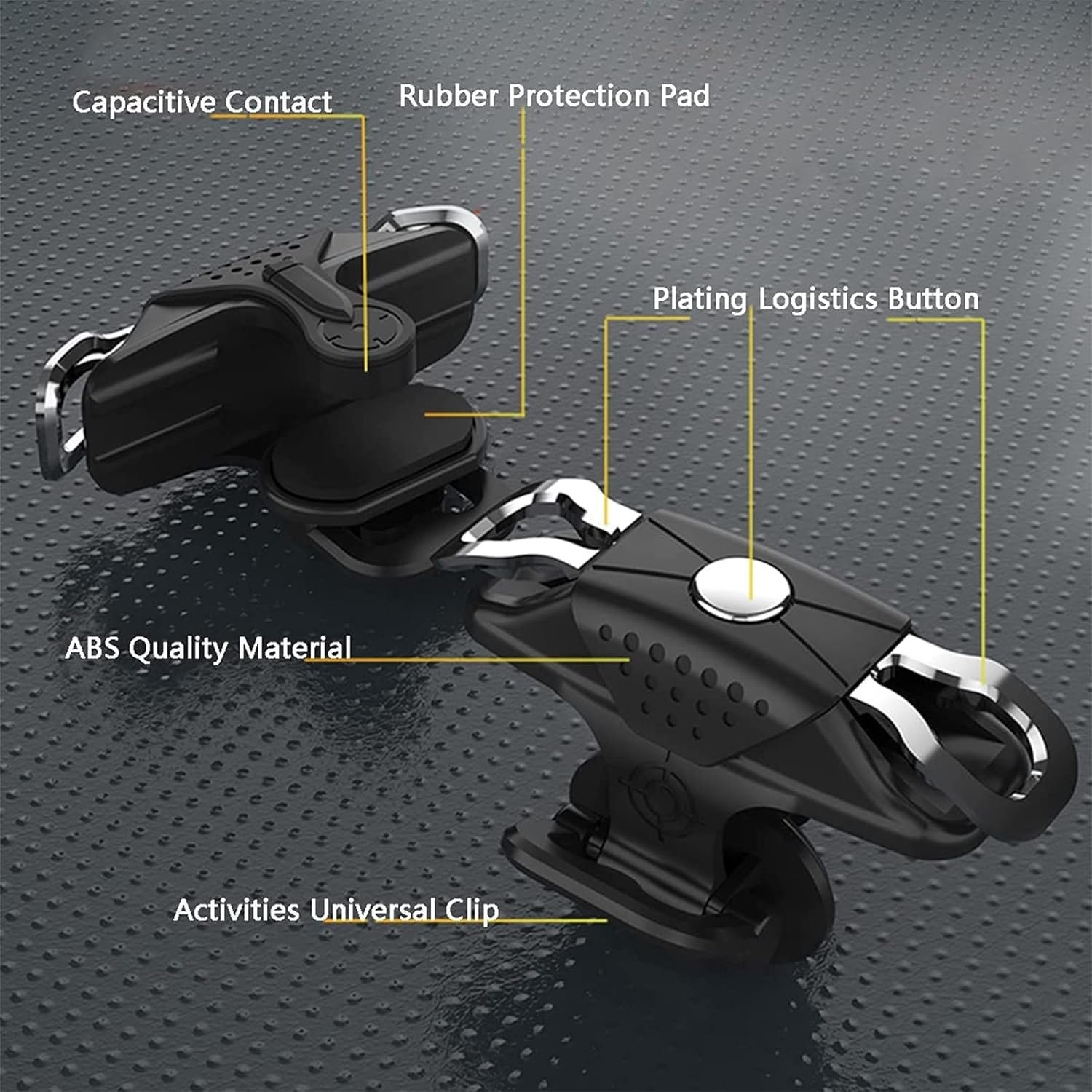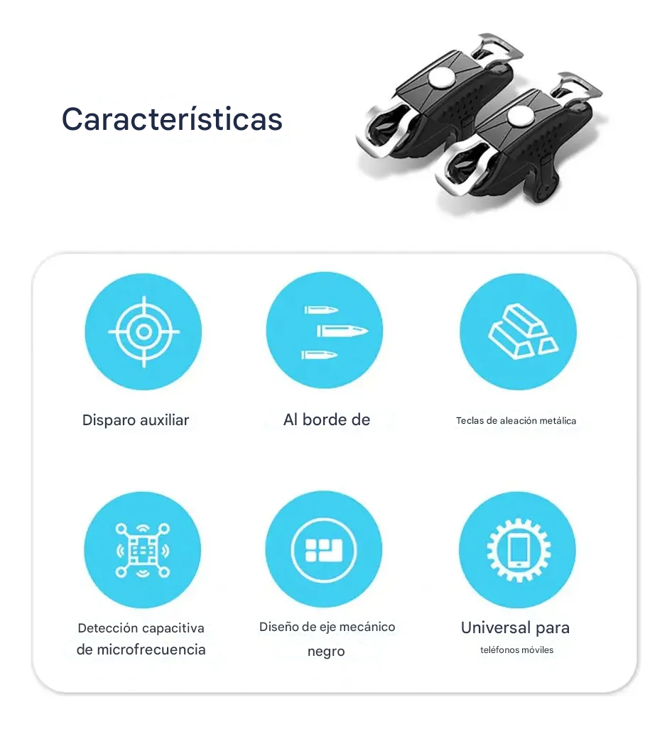 Gatillos Gamers mas dedales Tecla de disparo de juego X10 para iPhone, Android, botón de controlador de juegos auxiliar bidireccional, sensible, alta resistencia, 1 par El disparador para juegos es fácil de instalar, lo que le aporta comodidad. Puedes disfrutar de una experiencia de juego más excelente y emocionante con el disparador de juego que se caracteriza por una respuesta rápida y sensible. Hecho de material ABS y aleación de zinc, el gatillo para juegos es inoxidable y duradero de usar. El diseño bidireccional lo hace más práctico de usar. La longitud de un solo disparador para juegos es de 5cm, el ancho es de 3cm y la altura es de 2cm, por lo que no bloqueará la pantalla y afectará el uso de su teléfono. El disparador para juegos es universal, que es adecuado para iPhone y para teléfonos Android en la mayoría de los casos. Nombre del artículo: disparador para juegos Material: ABS, aleación de Zinc Modelo: X10 Color: azul transparente Método de emparejamiento: Tipo de hebilla Distancia de transmisión: Jog Características: sensible, Universal, fácil instalación Detalles del tamaño: 5cm x 3cm x 2cm/1,97 pulgadas x 1,18 pulgadas x 0,79 pulgadas (aprox.) Notas: Debido a la luz y a la diferencia de ajuste de la pantalla, el color del artículo puede diferir ligeramente de las imágenes. Permita una ligera diferencia de dimensión debido a la medición manual. El paquete incluye: 1 par de gatillos de juego Obsequio 1 par dedales
