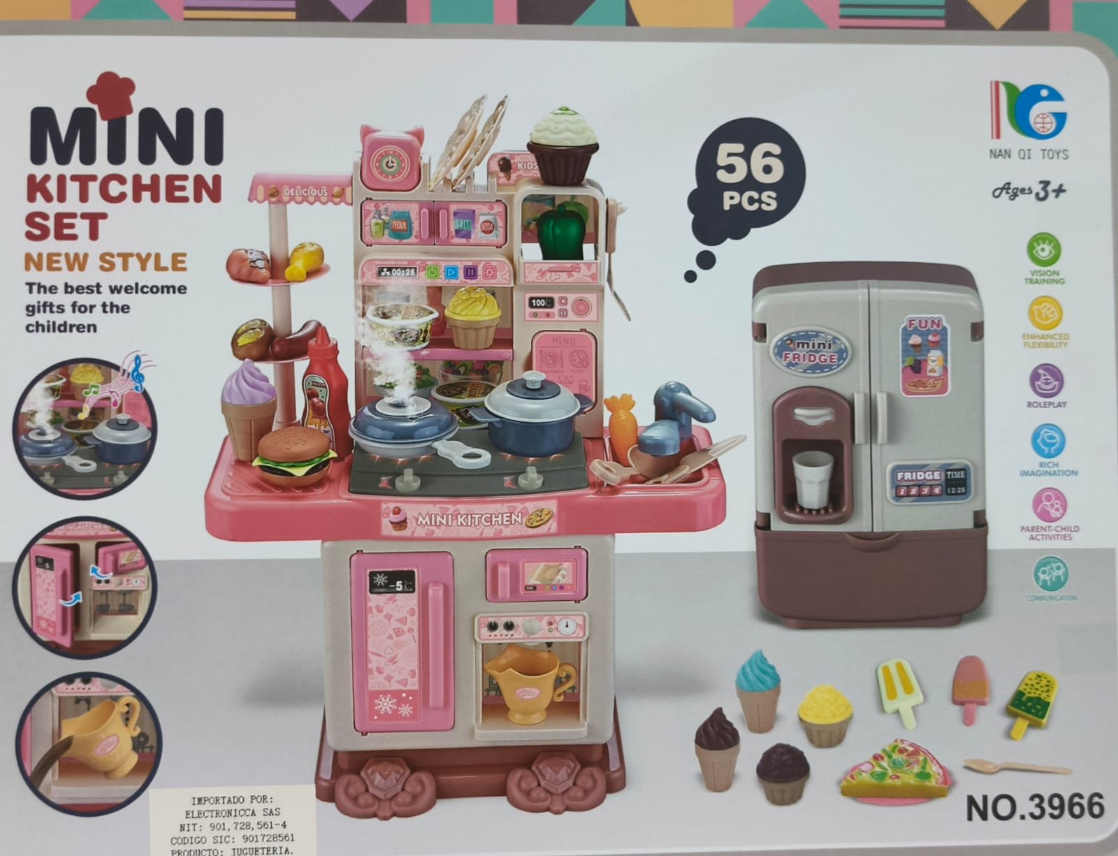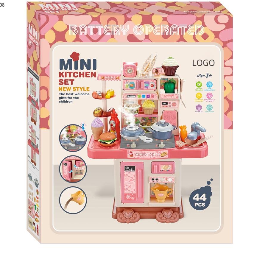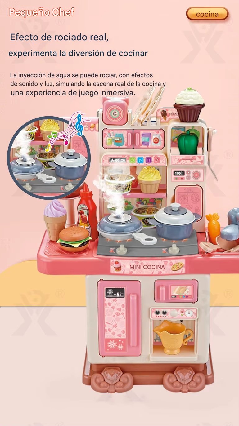 Característica 3: Se utiliza un modelo de cocina de plástico Rosa realista, equipado con funciones simuladas de spray, iluminación y música, para proporcionar una experiencia de cocina real y estimular el interés de los niños en el juego de rol y la creatividad.
