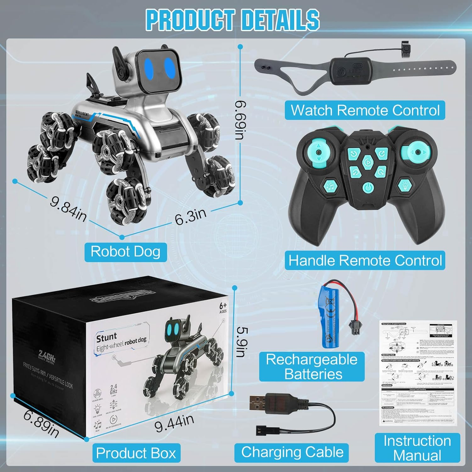 - Control dual: Con un control remoto manual de 2,4 GHz y un reloj con sensor de gestos, el automóvil con control remoto ofrece dos opciones de control. Ya sea que prefiera comandos de precisión de largo alcance o interacciones táctiles íntimas, el sistema de control dual permite un cambio perfecto entre modos.