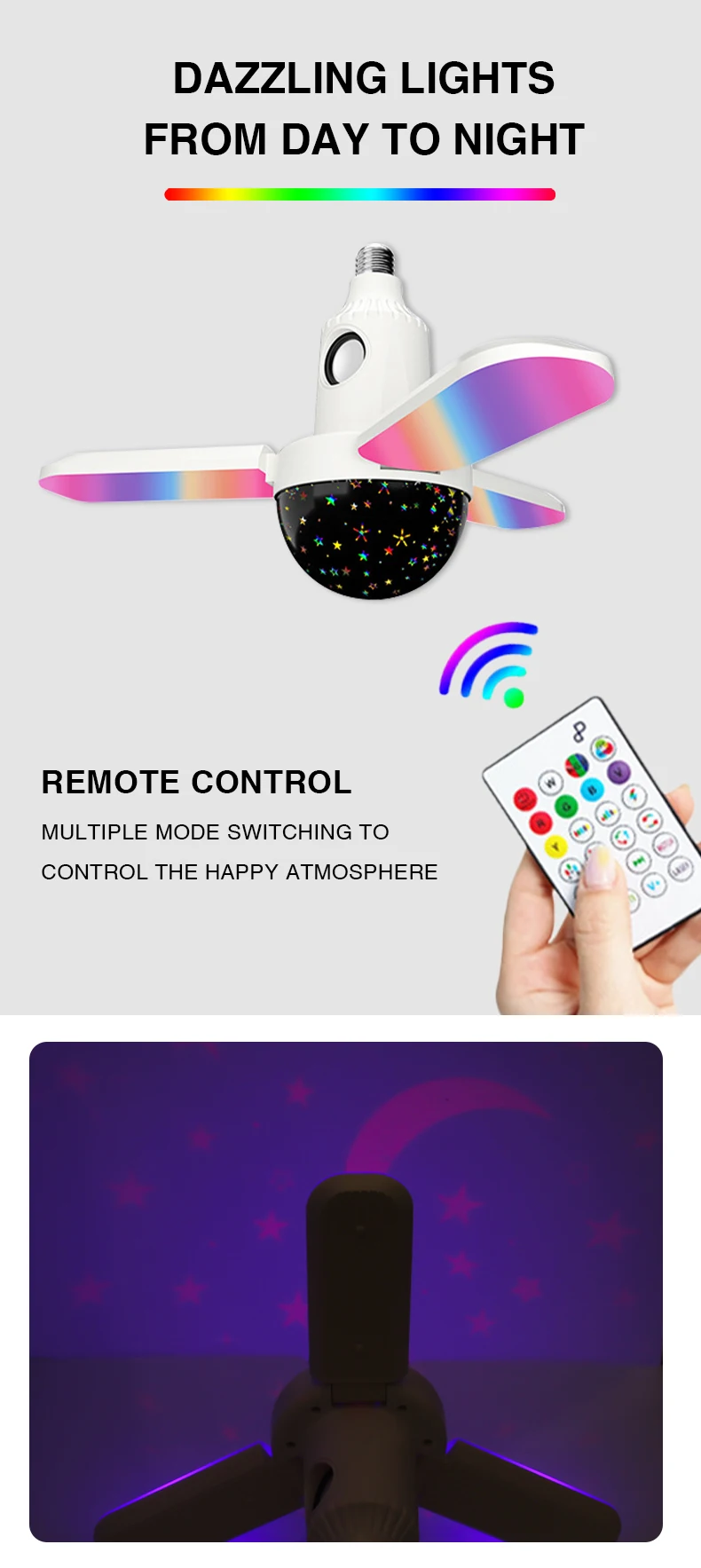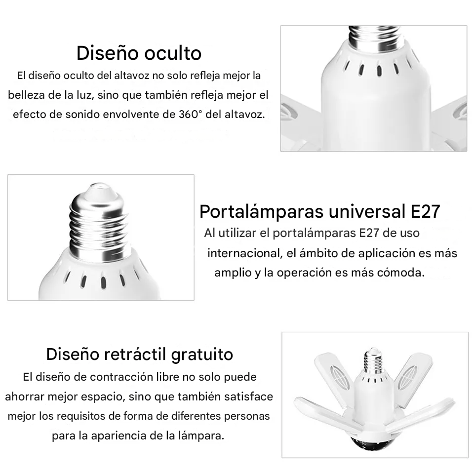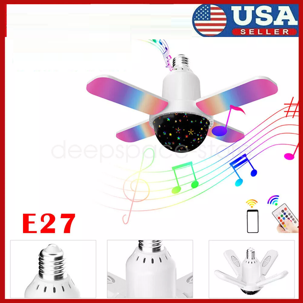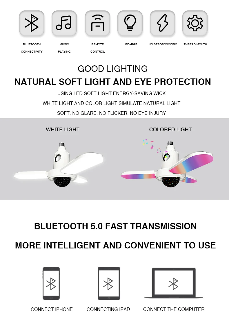 DPotencia: 40W Potencia del altavoz: 3W Voltaje: AC85-265V Tipo de Base: E27/B22 Tipo de Led: SMD2835 Color de emisión: BLANCO + RGB Material:ABS + PS Tamaño: 120*240mm Peso: 550g Medida de la caja de Color: 12,3*12,3*24,5 CM Cubierta: proyector de cielo estrellado/bola mágica Vida útil: 30000H Ángulo del haz: 120 grados Distancia de conexión entre dientes azules: 10 metros Distancia de conexión del Control remoto: 5-8 metros Características: 1. Luz LED inteligente habilitada para Bluetooth, multicolor y energéticamente eficiente que se puede controlar a través de su teléfono inteligente mediante Bluetooth inalámbrico, ahorro de energía y música de soporte de buena calidad Se puede controlar a través de un teléfono inteligente o tableta/lámpara LED Bluetooth 2. Apariencia/16 opciones de Color diferentes.-conexión inalámbrica de Bluetooth. 3. Volumen ajustable de luz y música-luz brillante, comparable a una bombilla halógena de 50 vatios. 4. No desmonte ninguna bombilla usted mismo. El color de la luz es ajustable por el mando a distancia Con 4 modos de efectos de iluminación. 5. Conexión Bluetooth inalámbrica: la bombilla se puede apagar con el control remoto, y aún Puedes usarla como altavoz.