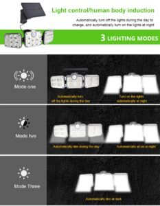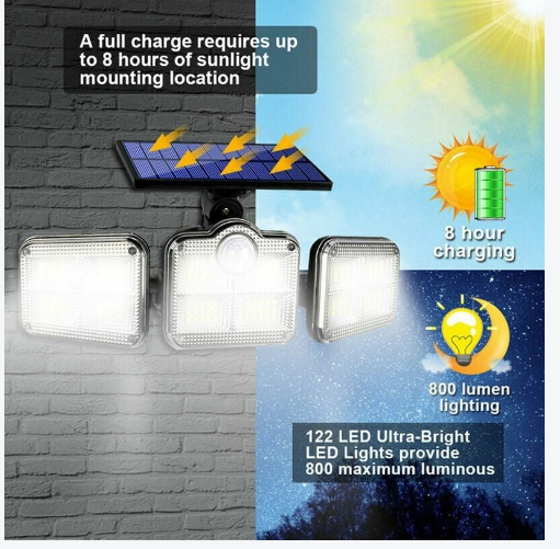 /> La luz del sensor de movimiento solar está equipada con una luz COB súper brillante. El panel solar utiliza silicio monocristalino, que tiene una alta tasa de conversión. IP65 a prueba de agua, no tiene que preocuparse por el mal tiempo.