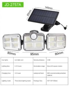 Panel solar: silicio monocristalino de 5,5 V Entrada de lámpara automática de 1,8 W: 1 * 3,7 V 2400 mAh Control remoto: 1 * R2032 Material seguro: ABS+ Resistente al agua para PC: IP65 Ángulo del sensor: 120 grados Tipo: JD-2757 (122 SMD, integrado),  (Opcional) Tamaño del cuerpo: 195 * 130 * 100 mm / 7,7 * 5,1 * 3,9 pulgadas