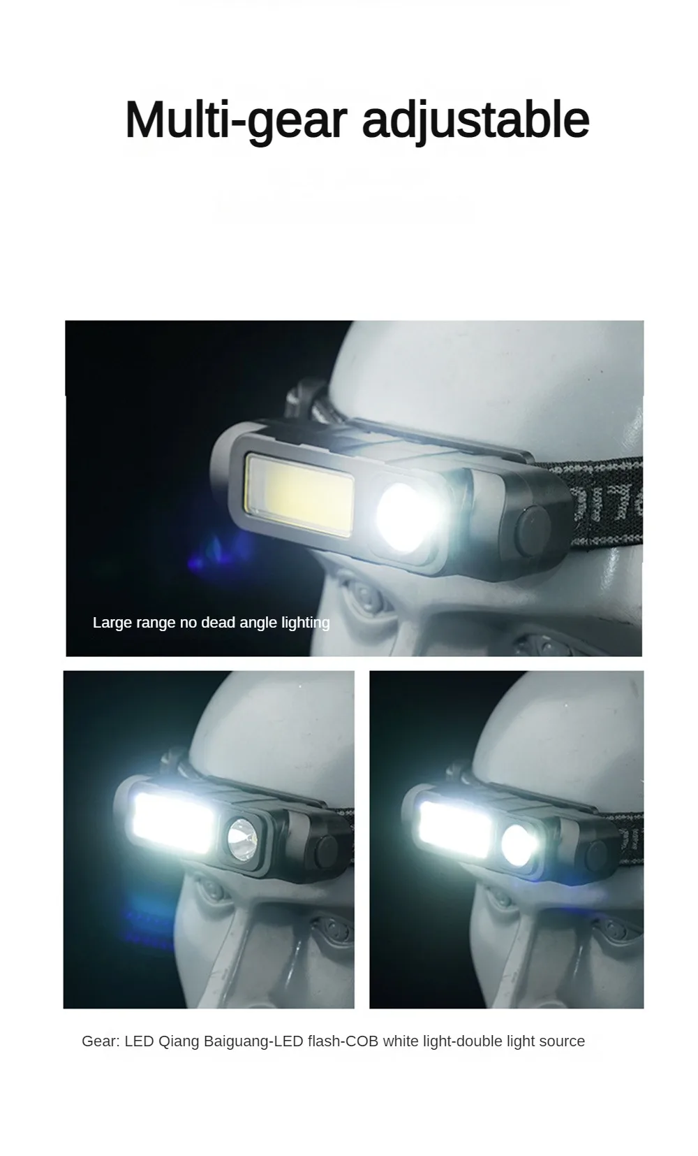 1.LED HOR, faros portátiles para exteriores, equipados con cuentas de lámpara de fuente de luz, alto brillo, pureza de color, vida útil, salida de fuente de luz estable2. Se pueden ajustar múltiples engranajes para satisfacer sus diferentes necesidades de iluminación. No hay iluminación de ángulo muerto en un rango grande. Equipo: LED luz blanca fuerte-flash LED-Luz Blanca COB-fuente de luz dual3. Interruptor independiente, inicio conveniente, presione brevemente el interruptor de encendido para cambiar el engranaje de brillo4. Resistente al agua, sin miedo al viento y la lluvia, estampado de microondas resistente al agua, lluvia y tormenta de nieve se pueden usar normalmente5. Carga USB inteligente, utilizando un sistema de carga diversificado, modo de carga de interfaz unificada, carga rápida de alta corriente, conveniente, seguro y práctico