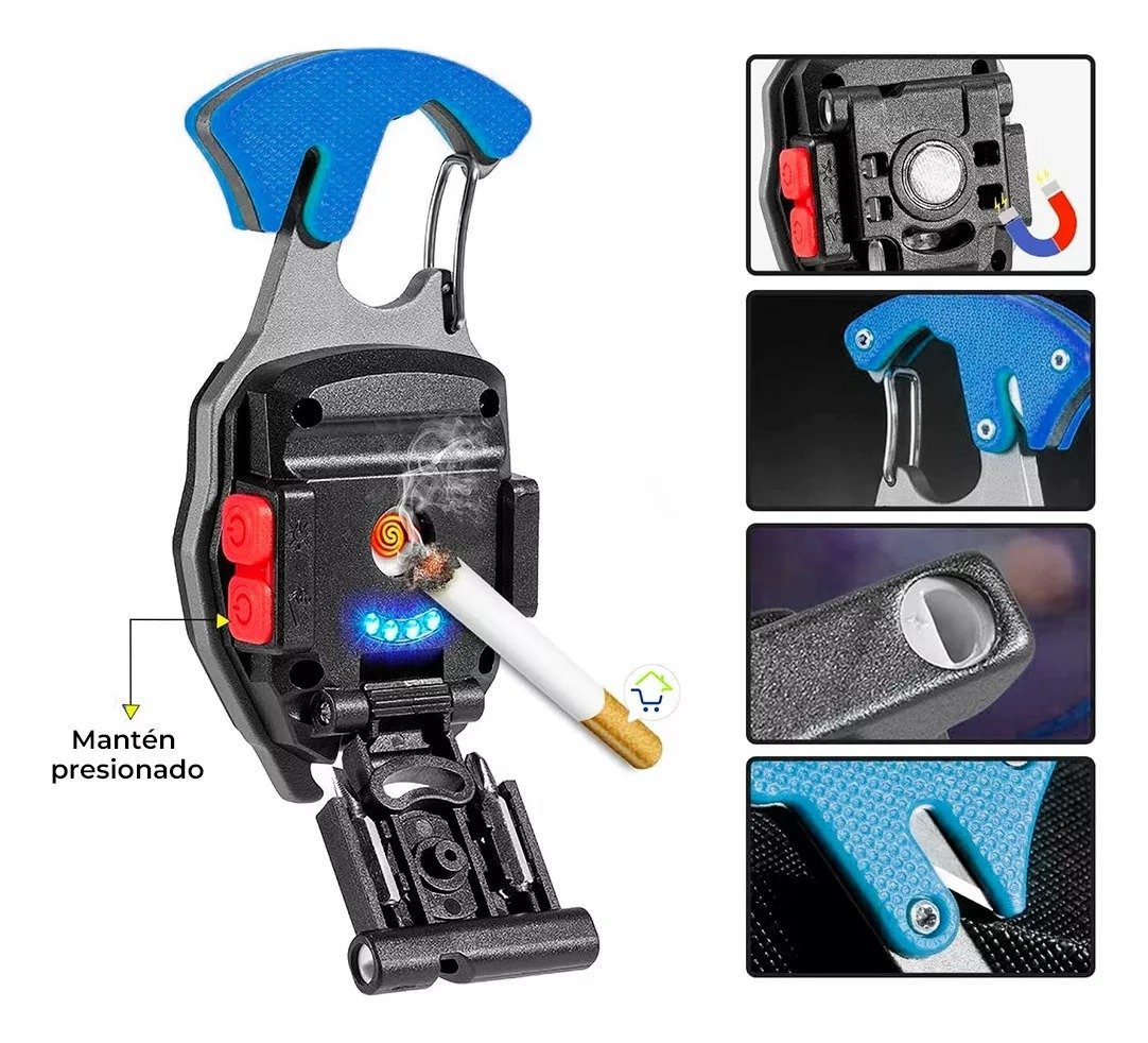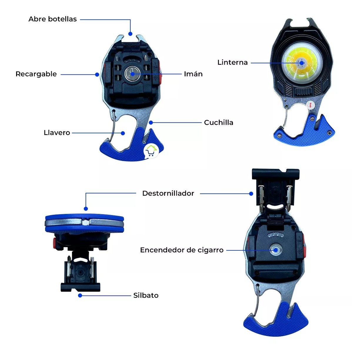 Funciones: Linterna, llavero, destornillador, silbato, encendedor de cigarrillos, abre botellas. cuchilla, imán, recargable.