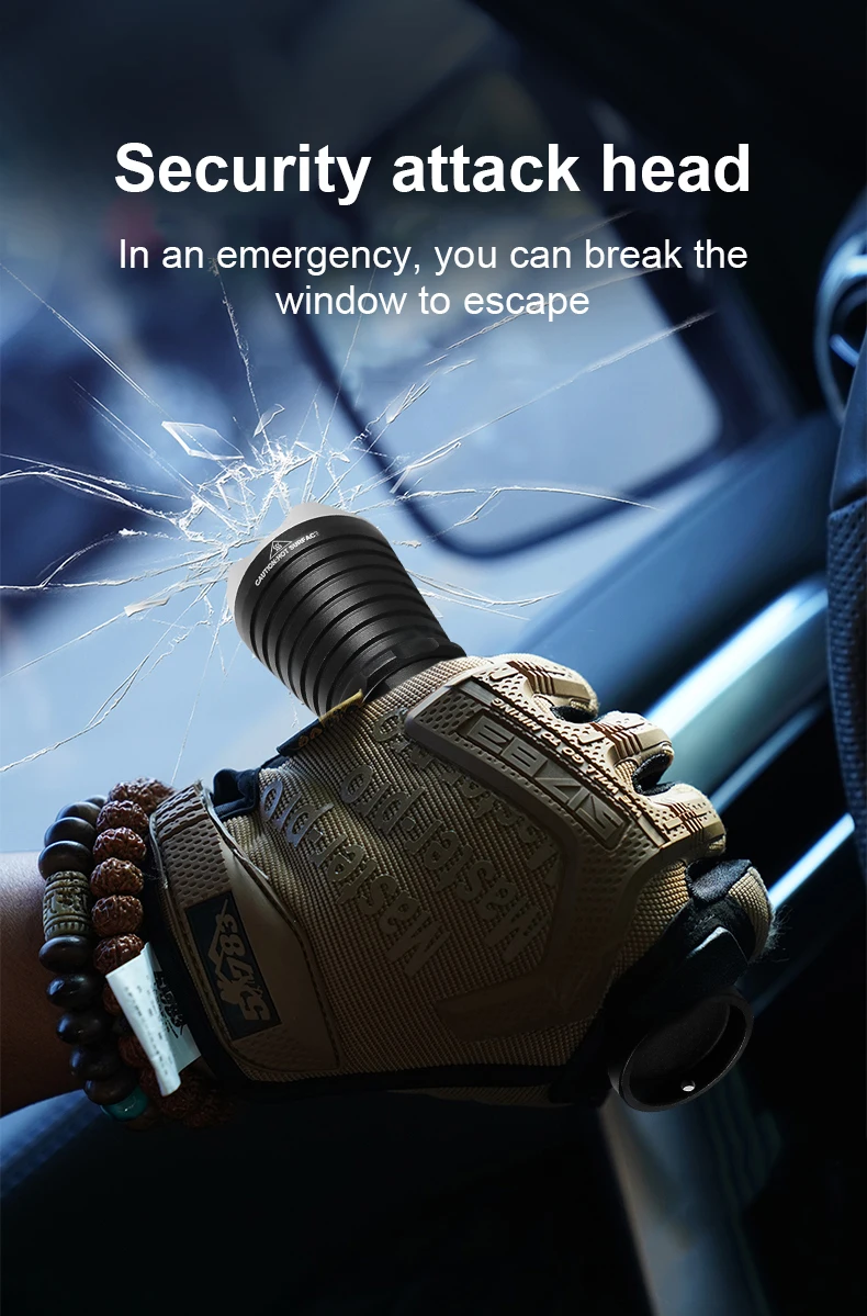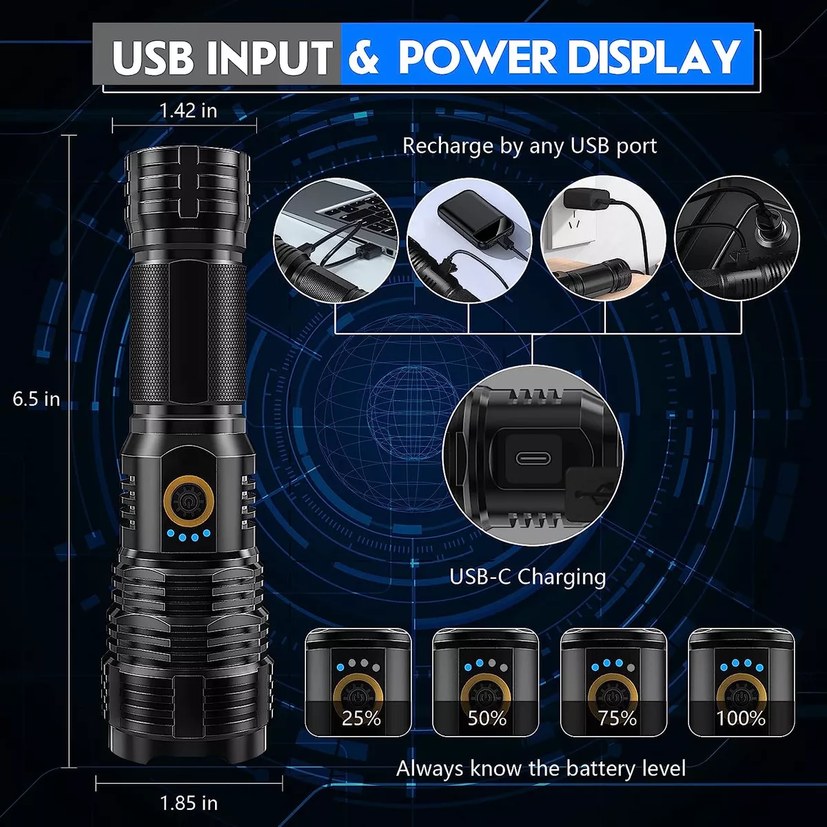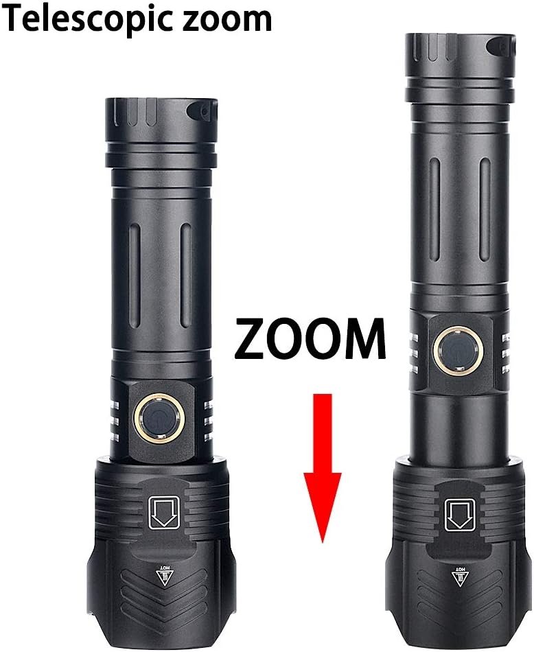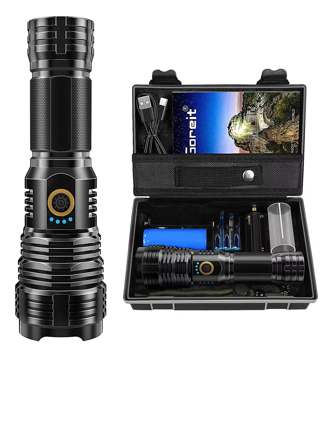 Haz de luz LED XHP100 ultrabrillante: esta linterna de mano adopta un chip LED XHP100 de nueve núcleos con una salida máxima de 9000 lúmenes, cuya vida útil podría alcanzar hasta 50 000 horas. Este tipo de haz de luz es mucho más brillante que el haz de luz LED XHP50/70/90/T6/L2. Además, al utilizar lentes ópticos convexos profesionales, la distancia de iluminación es de hasta 650 metros.