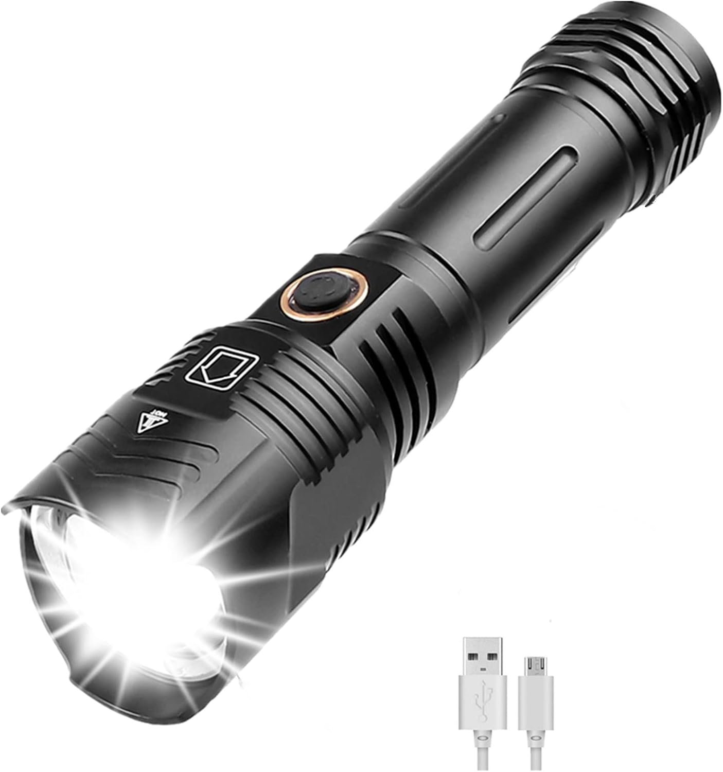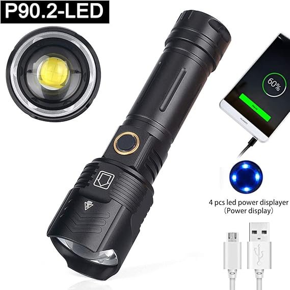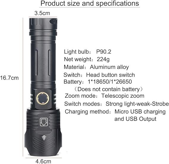 - Batería recargable con entrada y salida: viene con puerto de carga de entrada y salida 5V1A. Esta lámpara de antorcha tiene un puerto de carga micro USB incorporado, lo que significa que se puede recargar conectándola con cualquier fuente de alimentación con puerto de carga micro USB, como computadora, computadora portátil, cargador de automóvil, etc. La salida 5v1A puede cargar su teléfono por completo al menos dos veces. . Alimentado por 1 batería 26650 que funciona durante 5 a 8 horas. Duradero para acampar, hacer caminatas, cazar, pescar, patrullar, trabajos de construcción y uso diario.