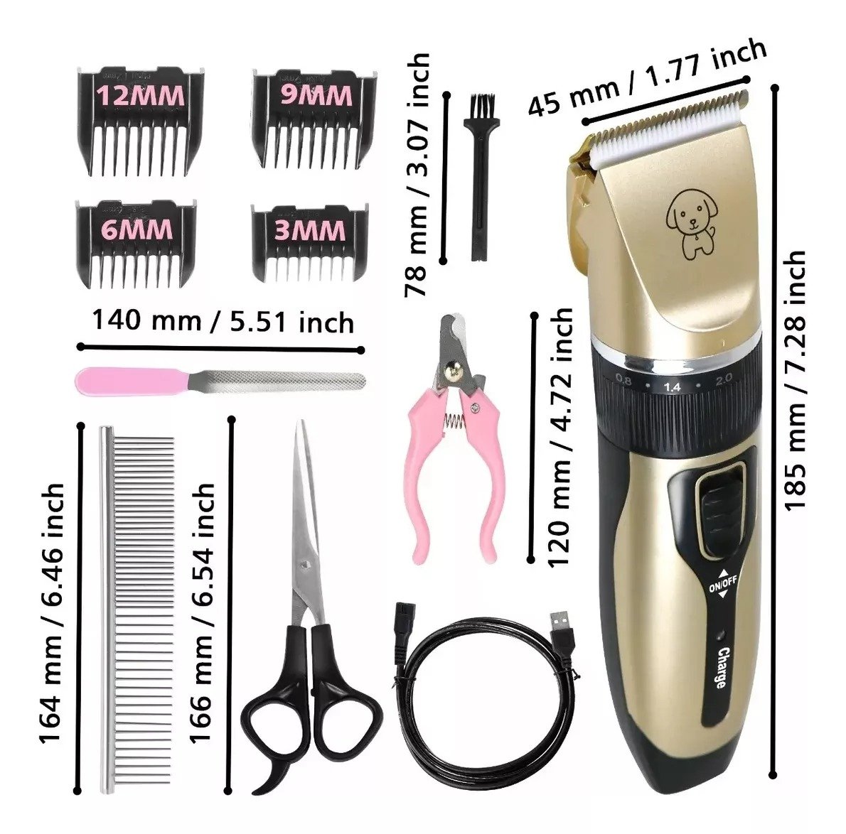 【Kit de cuidado profesional para mascotas】Este cortapelos para mascotas contiene: 1 cortapelos para mascotas con cuchillas de aleación de titanio y cerámica antialérgicas (batería recargable incluida), 1 cepillo de limpieza, 1 cable USB, 4 accesorios de peine (3/6/9/12 mm).