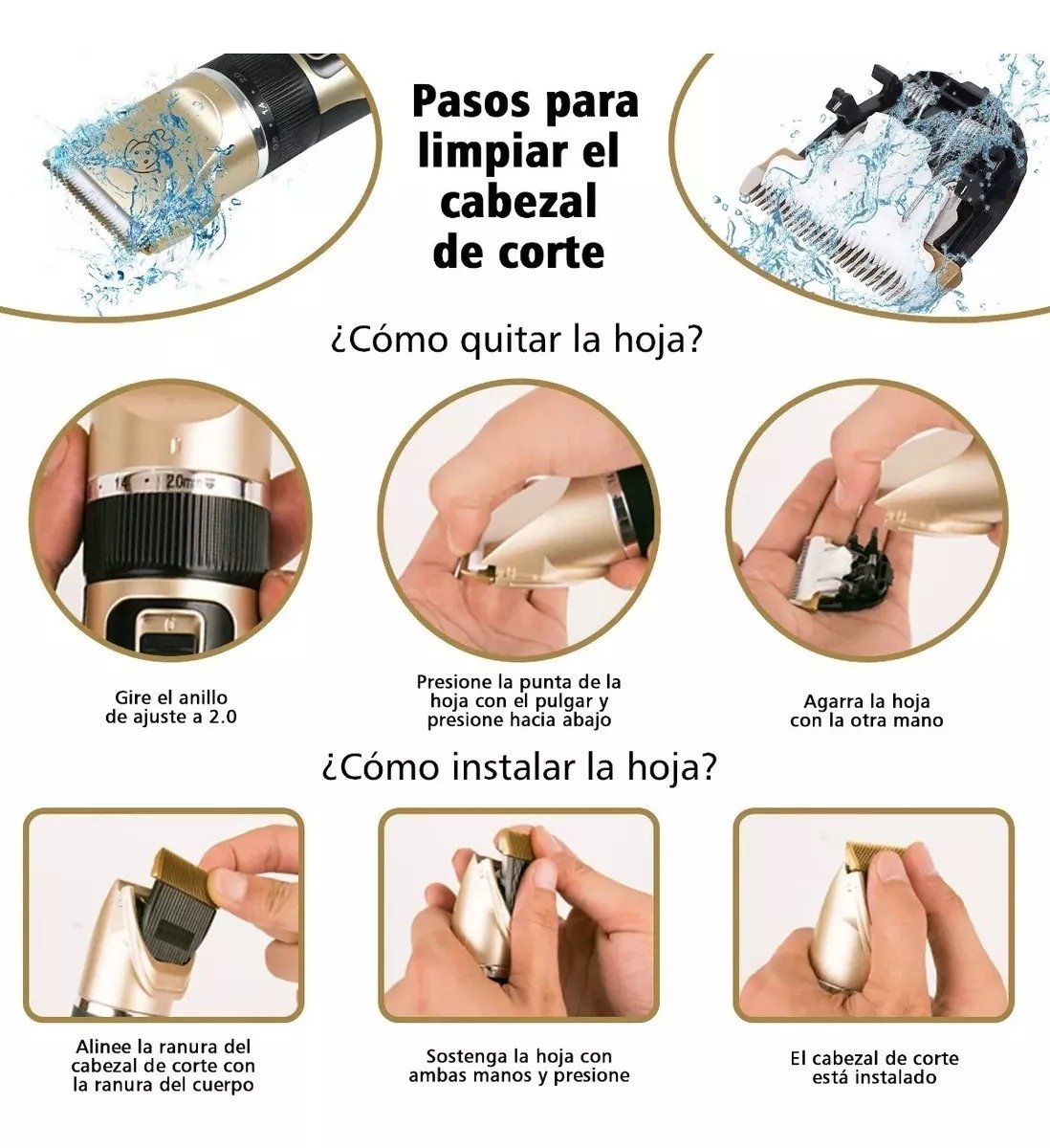 Nota: si el pelo de su mascota es largo y denso, debe usar primero las cortadoras más cortas, de lo contrario, las cortadoras pueden atascarse y no funcionar correctamente.