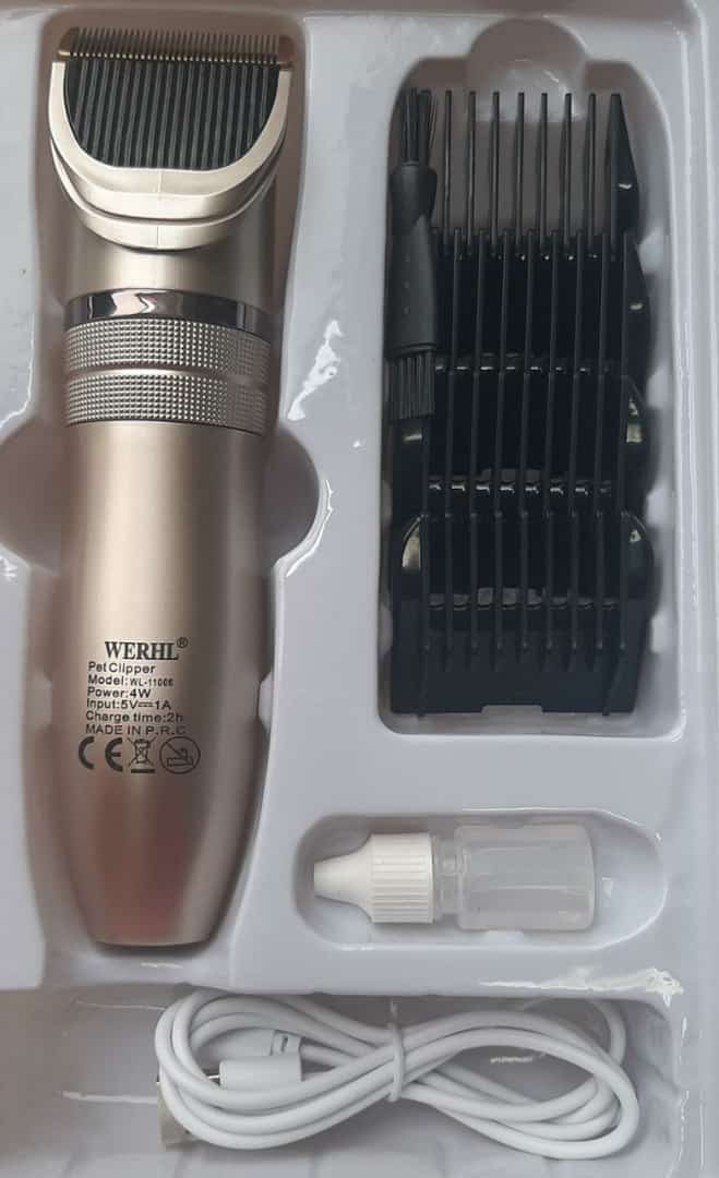 Máquina para perros de alta calidad y bajo sonido.Increíble producto a un bajo precioPet clipper peloCon y sin usoTensión: 110-240 v/3 wTamaño: 17,5*4 cmRecargable charging carga 8 horasCabeza de cortador de cerámica de titanio, pelo afilado nunca cortado4 Uds límite peine: 3mm 6mm 9mm12mm Accesorios 1.4 tipos de accesorios de longitud fija 2.Lubricante para cabezal de corte 3.Cable de carga USB 4.Cepillo de limpieza 5.comb Potencia 4W Entrada 5V / 1A Tiempo de carga 2h Marca – WERHL Modelo – WL-11006 RecargablePoder 4w