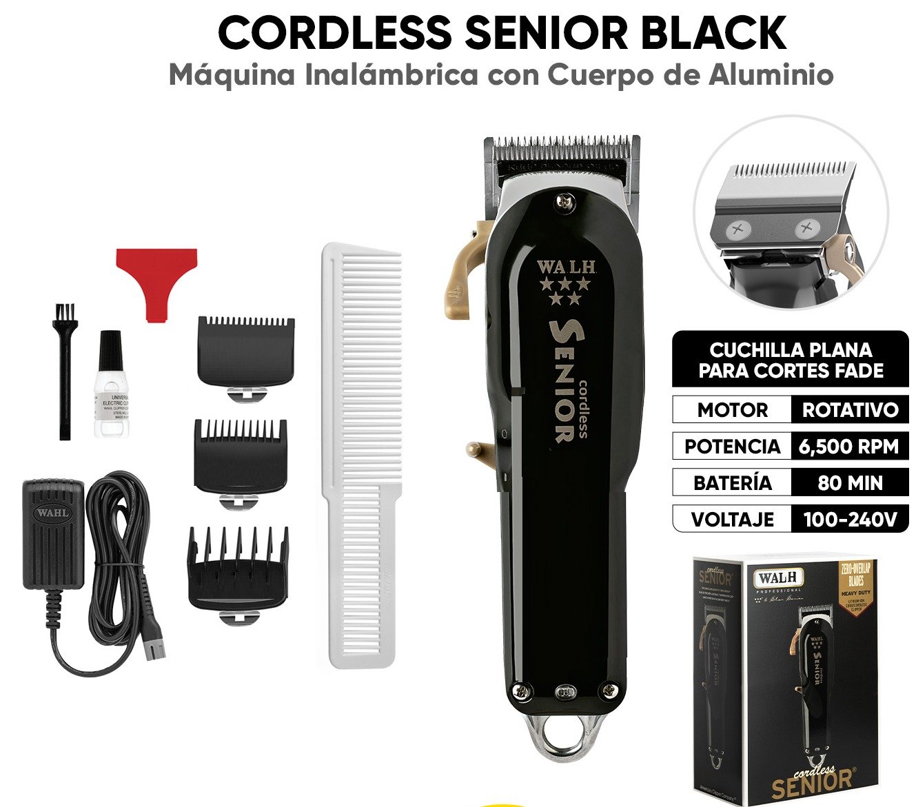 – Cuchillas FADE, cromadas de alta precisión con palanca cónica.