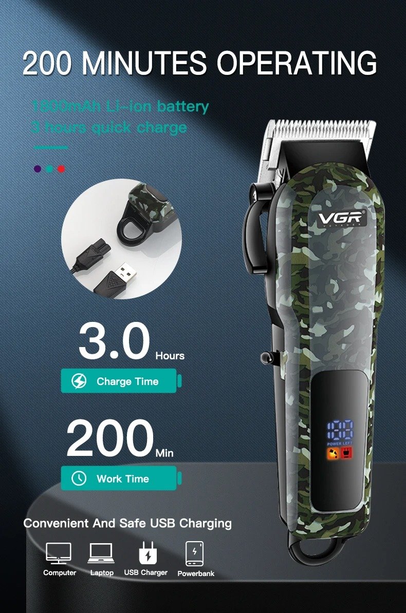 Esta cortadora VGR es recargable e inalámbrica, que le permite hacer un corte de pelo o un peinado de barba sin un cable largo. El cable/inalámbrico le permite usar la cortadora con batería o cuando se está cargando. Está equipado con una versión mejorada.USBCable de recarga para una carga rápida en cualquier lugar y en cualquier momento.