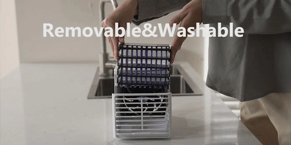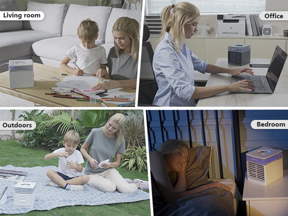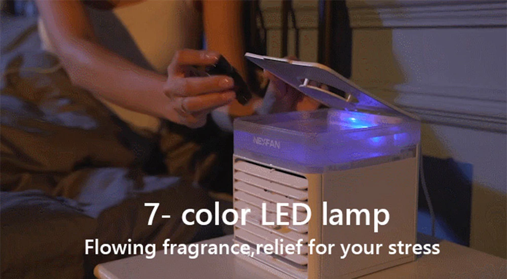 El enfriador de aire portátil con sistema de esterilización UV puede desprender aire fresco, fresco y limpio para que se sienta cómodo. Gran angular de 90° y 3 velocidades para ajustar para proporcionar una temperatura cómoda. Con luces LED de colores para proporcionar un ambiente romántico por la noche. Perfecto para uso en interiores.