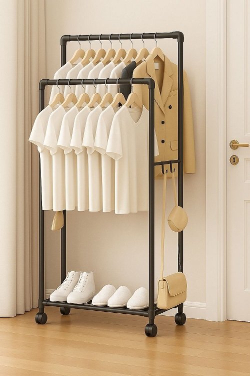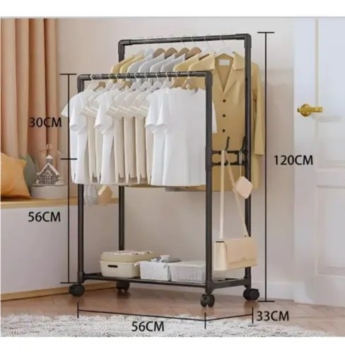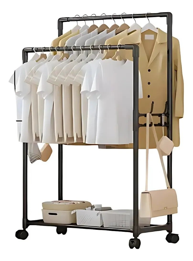 Organiza tu ropa con el práctico perchero doble con ruedas. Su diseño de alta resistencia te permite colgar más prendas, y sus ruedas facilitan el movimiento. Ideal para cualquier espacio que necesite un toque de orden y versatilidad.