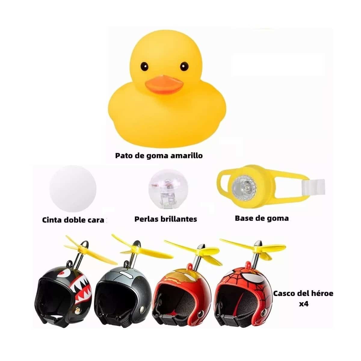 ¡Estos cuatro con diferentes cascos de héroes, patos especiales y únicos, te mantendrán infantil! Puede eliminar el aburrimiento de la vida con eficacia y agregar diversión a su vida. Como decoración, es adecuado para una variedad de escenas, y no solo para adultos, sino también para los niños; Perfecto para entretener a los más pequeños, cuando los tenga, ¡Definitivamente no puede dejar de amar! Amplia aplicación: un adecuado para al aire libre e interior, puede ser lindo, puede ser genial gadget! Cuando usted monta, viene con la correa de silicona extraíble puede fijarlo en el volante de la bicicleta, el mango de la puerta del coche y otros lugares, la hélice en la cabeza, pero también girará con el viento; Puede usar la cinta de doble cara que viene con, pegarlo en la parte delantera del coche, casco; Además de su viaje, también puede decorar su habitación, como escritorio, comedor, mesita de noche y otros lugares. Este pato parece animado y divertido.También un juguete para entretener a los pequeños. Diseño único: 4 pequeños patos amarillos lindos y juguetones, cada uno con un casco con un tema heroico diferente, con hélice, girando con el viento; Las gafas de sol frescas, collar de cadena de oro hacen que este lindo pato sea más fresco. Y también equipamos una perla brillante para este pato, ponlo en el estómago del pato, puede ser brillante. Chirrido cuando usted aprieta, más diversión para usted con los niños. Material seguro: hecho de silicona segura y no tóxica, sin ningún daño, suave, suave y elástico, muy respetuoso con la piel y no fácil de dañar. Este producto es adecuado para cochecitos, bicicletas, motocicletas, coches y todo lo que tiene un agarre o puede ser utilizado para pegar superficies planas (como sobremesa, pared, suelo, etc.). ¡Funciona para casi todos los escenarios, no hay necesidad de preocuparse por el problema de uso!.