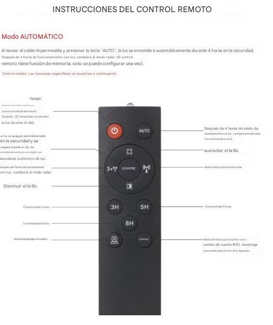 Modo, Modo 3 + X (encendido constante durante 3 horas, cambia automáticamente al radar después de 3 horas), Modo 4 + X (encendido constante durante 3 horas, cambiar automáticamente al radar después de 3 horas), etc. Los usuarios pueden elegir las soluciones de iluminación y monitoreo más adecuadas según las diferentes regiones y estaciones. El rango de detección del radar es de 6-8 metros y se puede activar continuamente.