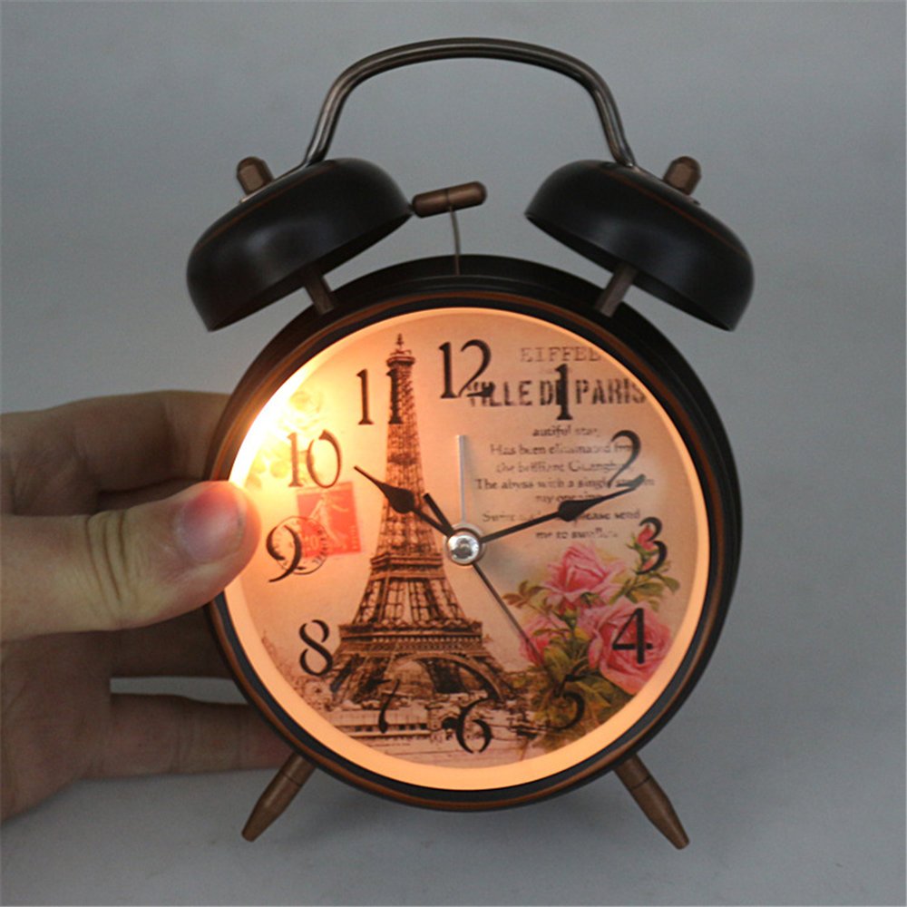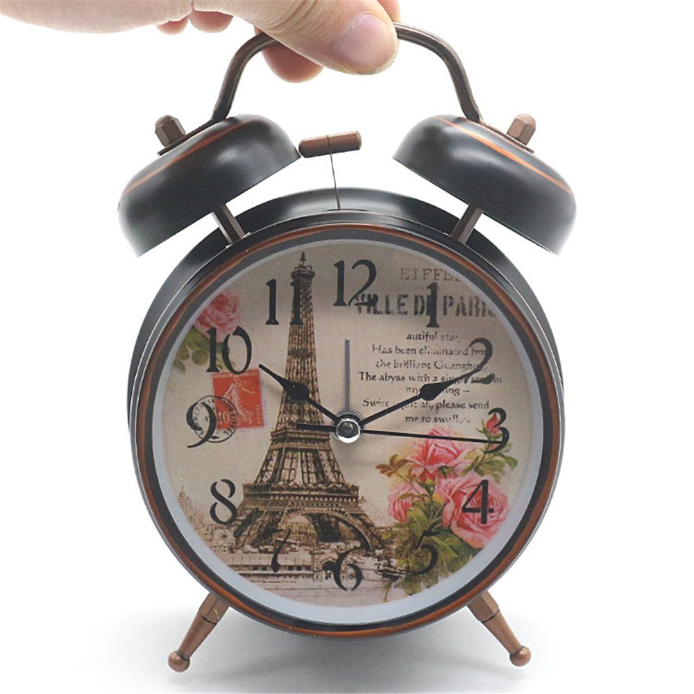 Reloj despertador con función de luz nocturna Vintage patrón de la Torre Eiffel Metal artístico reloj de alarma de aguja silenciosa para decoración del hogar
