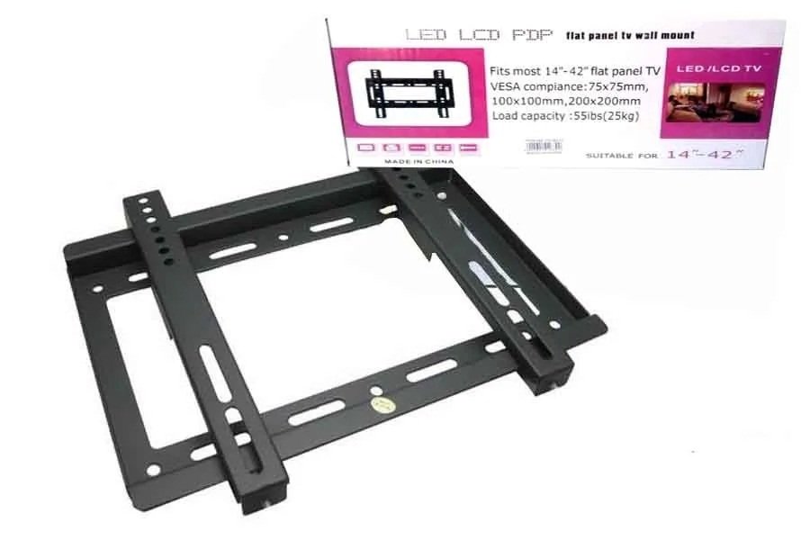 Soporte de muro para televisores LCD, LED 14”a 42”, soporta hasta 25 Kg. Hecho de acero , de color negro. Ideal para colocar tu televisor de una forma distinta y así ahorrar espacio en tu hogar. Incluye set de tornillos y tarugos. Producto en caja. Medidas del soporte es de 24cm de ancho x 21,5cm de alto x 1,6cm de grosor.