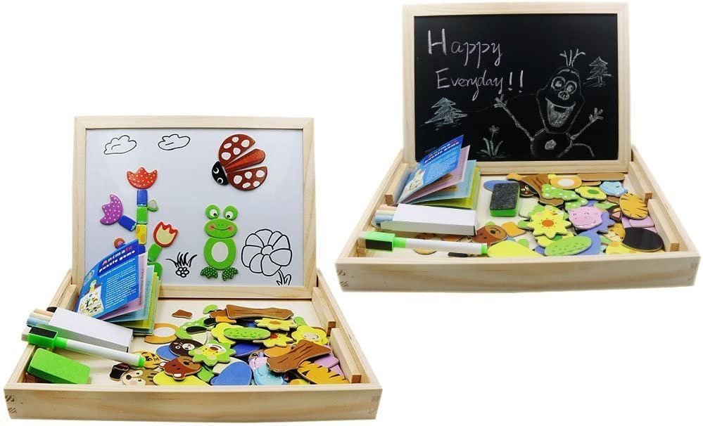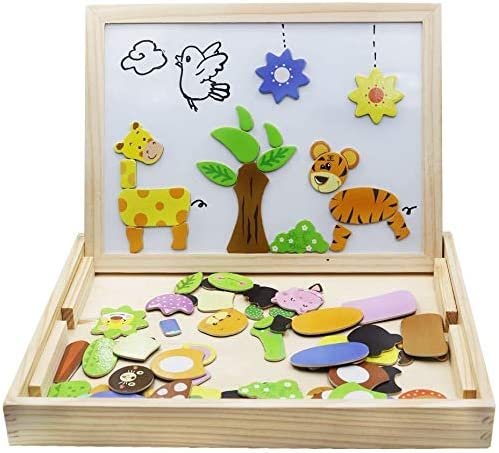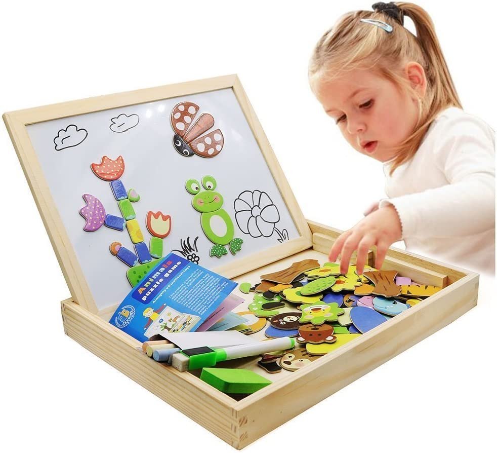 Las piezas magnéticas de animales y otras cosas educativas están disponibles en la caja. Los niños intentarán crear estos animales y criaturas en el lado blanco. Se pegarán muy fácilmente con el poder del imán.