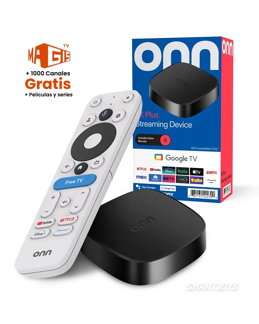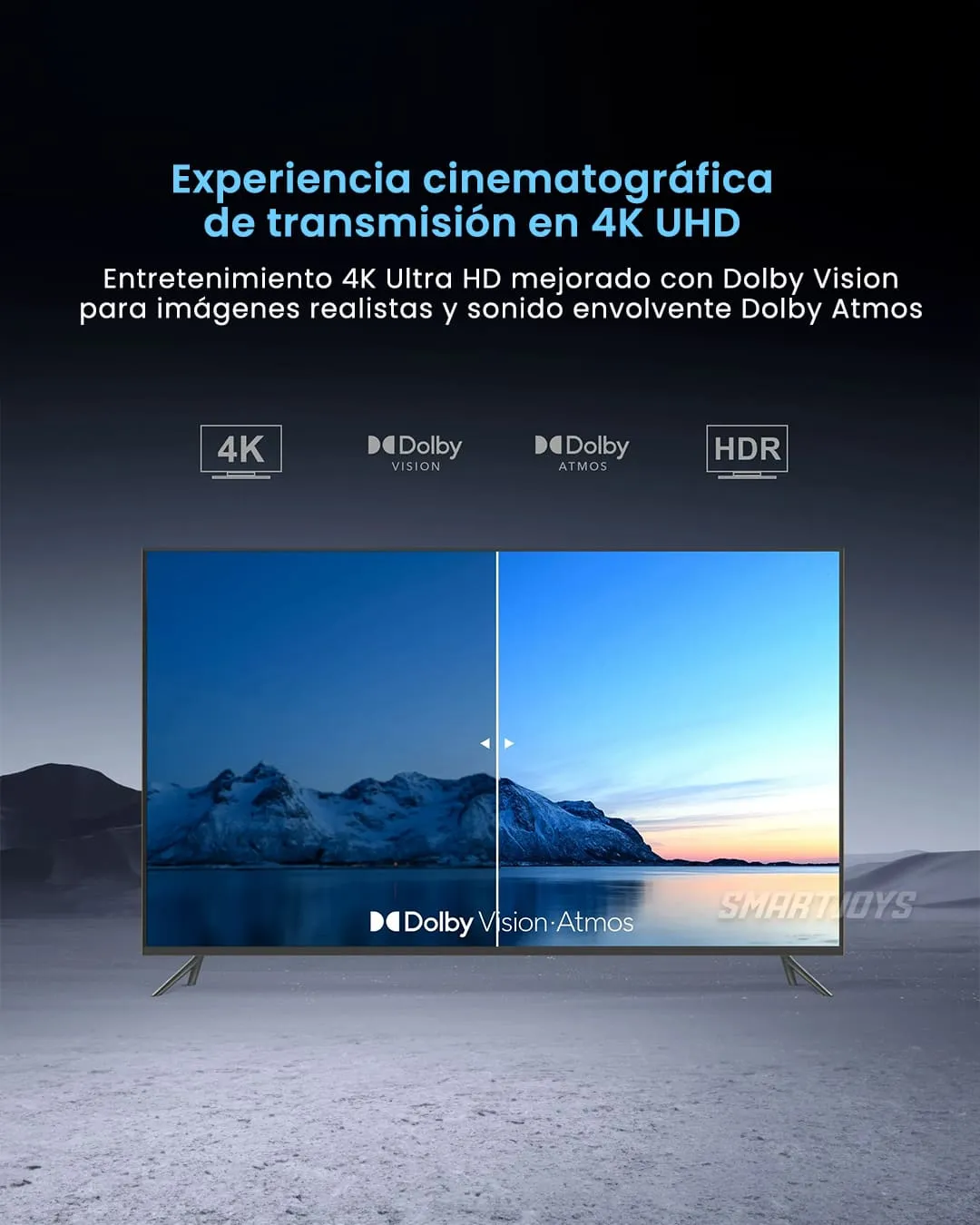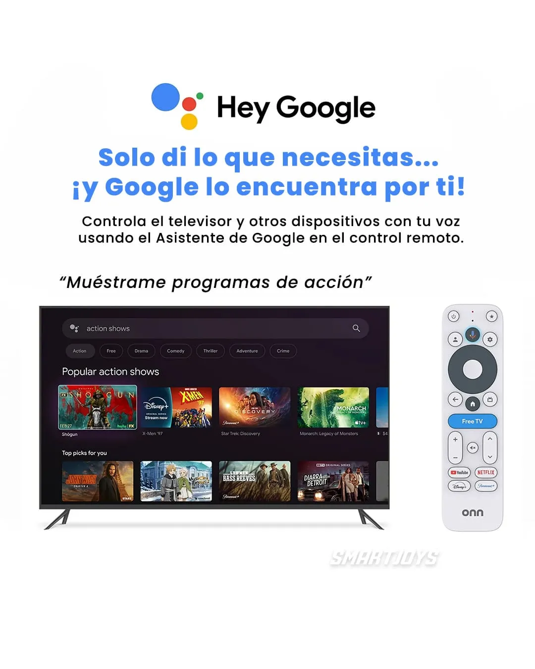 • Acceso instantáneo a más de 800 canales de TV en vivo y más de 700.000 películas y programas disponibles, ideal para los amantes del contenido sin límites.• Calidad de imagen 4K Ultra HD con Dolby Vision, que ofrece colores más vivos, negros más profundos y detalles impresionantes.• Audio inmersivo Dolby Atmos, que transforma tu sala en una experiencia de cine envolvente.• Transmisión sin interrupciones gracias a Wi-Fi 6, ideal para hogares con múltiples dispositivos conectados.• Control por voz con Google Assistant, para navegar, buscar o controlar la TV sin mover un dedo.• Compatibilidad con más de 10.000 aplicaciones, incluyendo Netflix, YouTube, Disney+, Prime Video y muchas más.• Sistema operativo Google TV, que organiza contenido por preferencias personales y facilita la navegación.• Almacenamiento interno de 16 GB, suficiente para instalar múltiples apps sin preocupaciones.• Diseño todo-en-uno compacto y elegante, fácil de instalar y mantener sin cables enredados. Especificaciones:• Resolución: 4K Ultra HD• Procesador (CPU): Quad-core Cortex-A55• Gráfica (GPU): G310